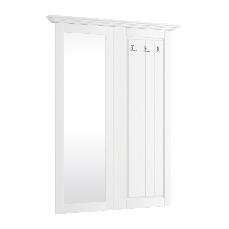 Jasny przedpokój w naturalnych odcieniach beżu i drewna. Duże lustro, wieszak z hakami na różnej wysokości i koszyk na drobiazgi. Przestrzeń wejściowa, która wita i organizuje zarazem.